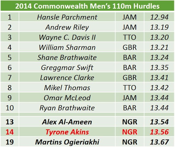 Amidst the ongoing controversy surrounding the American Athletes recently recruited to Team Nigeria, we analyse the chances of Nigeria’s current 110m Hurdles Champion, 28-year-old Tyron Akins, formerly of Team USA, in the 110m Hurdles at the Commonwealth Games on Tuesday, as well as the chances of runner-up at the Nigerian trials, 25-year-old Alex Al-Ameen, the former British athlete whose father is Nigerian.