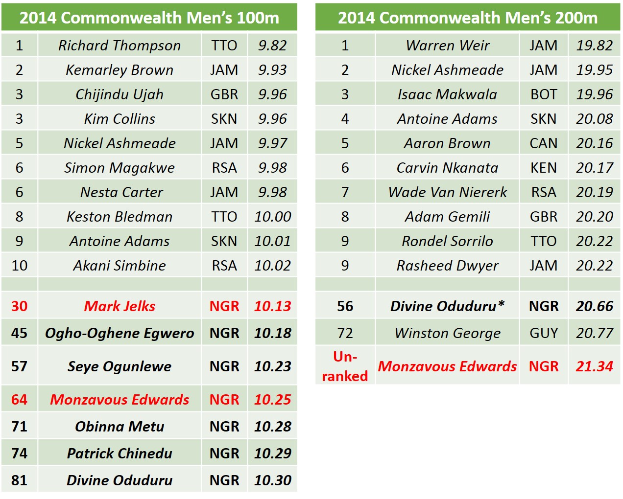 With Okagabre, Africa’s No. 1 Long Jumper, also not listed for the Long Jump at these African Championships, she seems set not to defend her African Long Jump Title which she won at the last two editions, most recently with a Championship Record of 6.96m in Benin Republic in 2012. That notwithstanding, Nigeria still looks likely to clinch at least two medals in the event, with the participation of both Ese Brume and Chinazom Amadi, Nigeria’s No. 3 and African No. 4 in the event, with 6.39m this season.